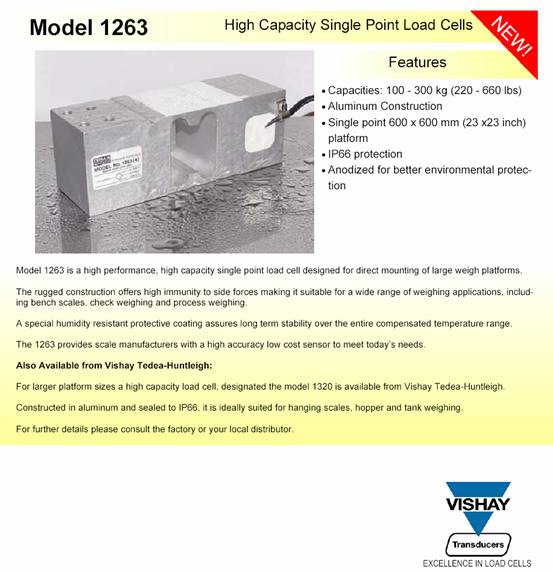 描述:1263是為大尺寸平臺(tái)秤設(shè)計(jì)的直接安裝的高性能高量程單點(diǎn)式傳感器。這個(gè)結(jié)構(gòu)保障了高的抗偏載能力,使得1263有廣泛的應(yīng)用領(lǐng)域,包括臺(tái)秤、分選秤、吊掛式電子秤和過程稱重。