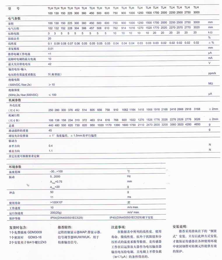 直線位移傳感器,量程可達3000mm 直線位移傳感器特點: 無桿設計 球鉸可避免側向力 使用壽命長-運行次數(shù)超過100*10^6 非線性度小 分辨率高于0.01mm 很高的運行速度 DIN 430650標準插頭和插座 防護等級IP54面向下安裝 直線位移傳感器說明: 外殼:鋁合金,經(jīng)陽極氧化處理 安裝:可調(diào)節(jié)固定支架 滑動部件:內(nèi)嵌有塑料的鋁材 連接器:球鉸,由一個淬硬的鋼球和彈簧、淬硬鋼板組件組成 電阻元件:導電塑料 電刷組件:貴金屬多觸電電刷,帶彈性阻尼 電氣連接:DIN3650標準4極插座