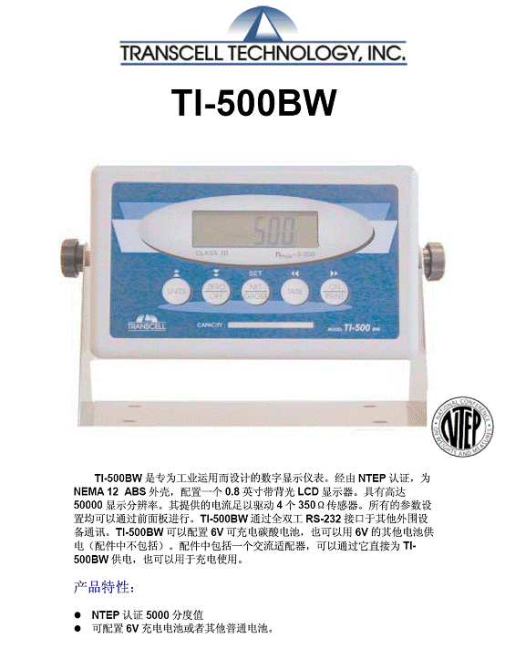 | 產(chǎn)品名稱:Transcell T1-500BW 數(shù)字顯示儀表(Indicator) |